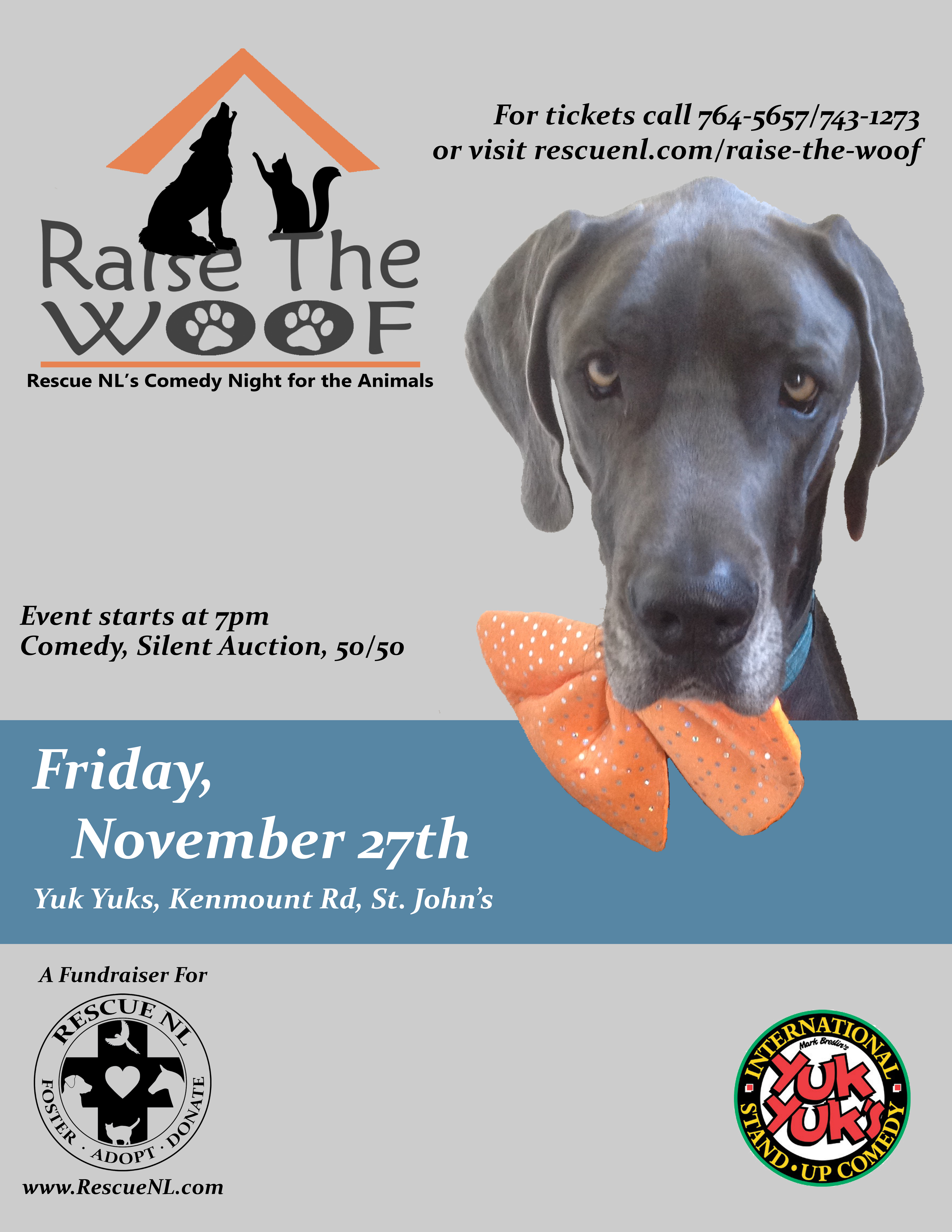 Join us on Nov 27th at Yuk Yuks for a night of comedy and help support Rescue NL. There will be a silent auction and 50/50 plus loads of laughs! Tickets are just $20 each!